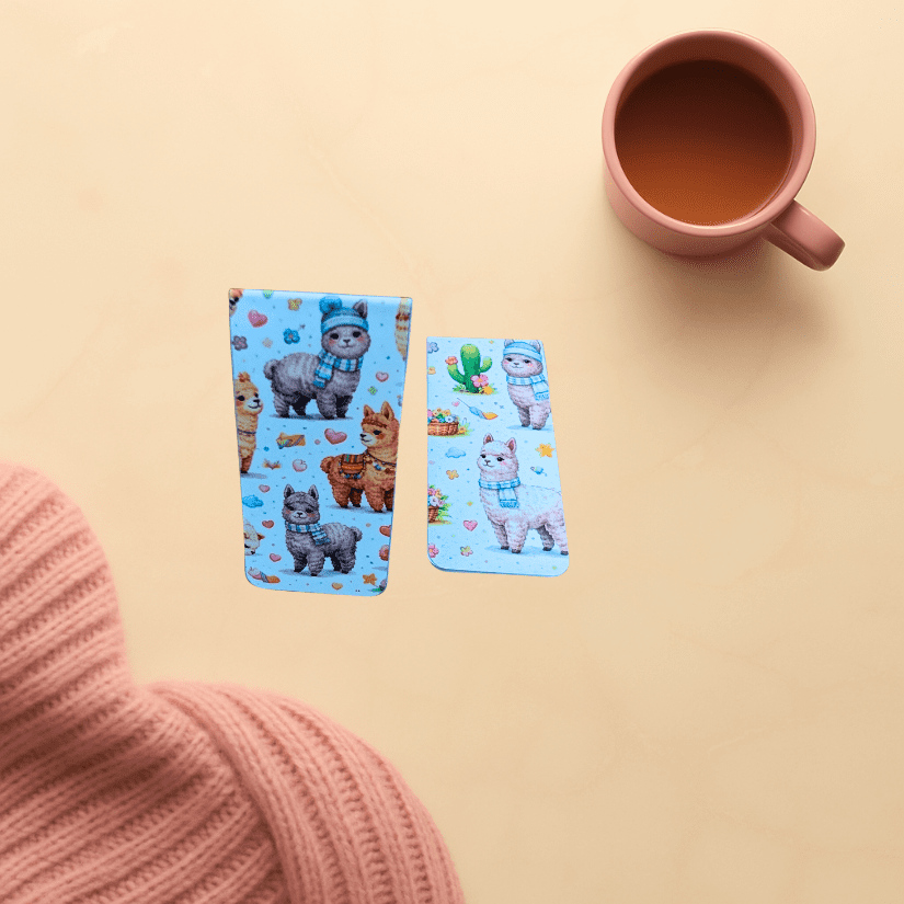 With sweet illustrated alpacas bundled up in scarves and surrounded by cozy details, this laminated bookmark duo is playful without being loud β perfect for readers who appreciate soft humor and gentle design. The lightweight magnetic closure hugs your pages securely while keeping your book safe and unbent.